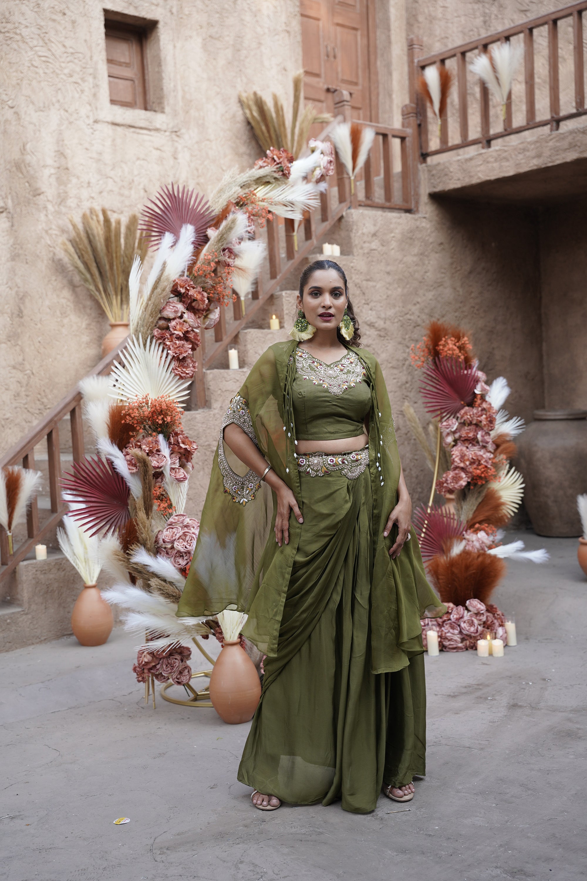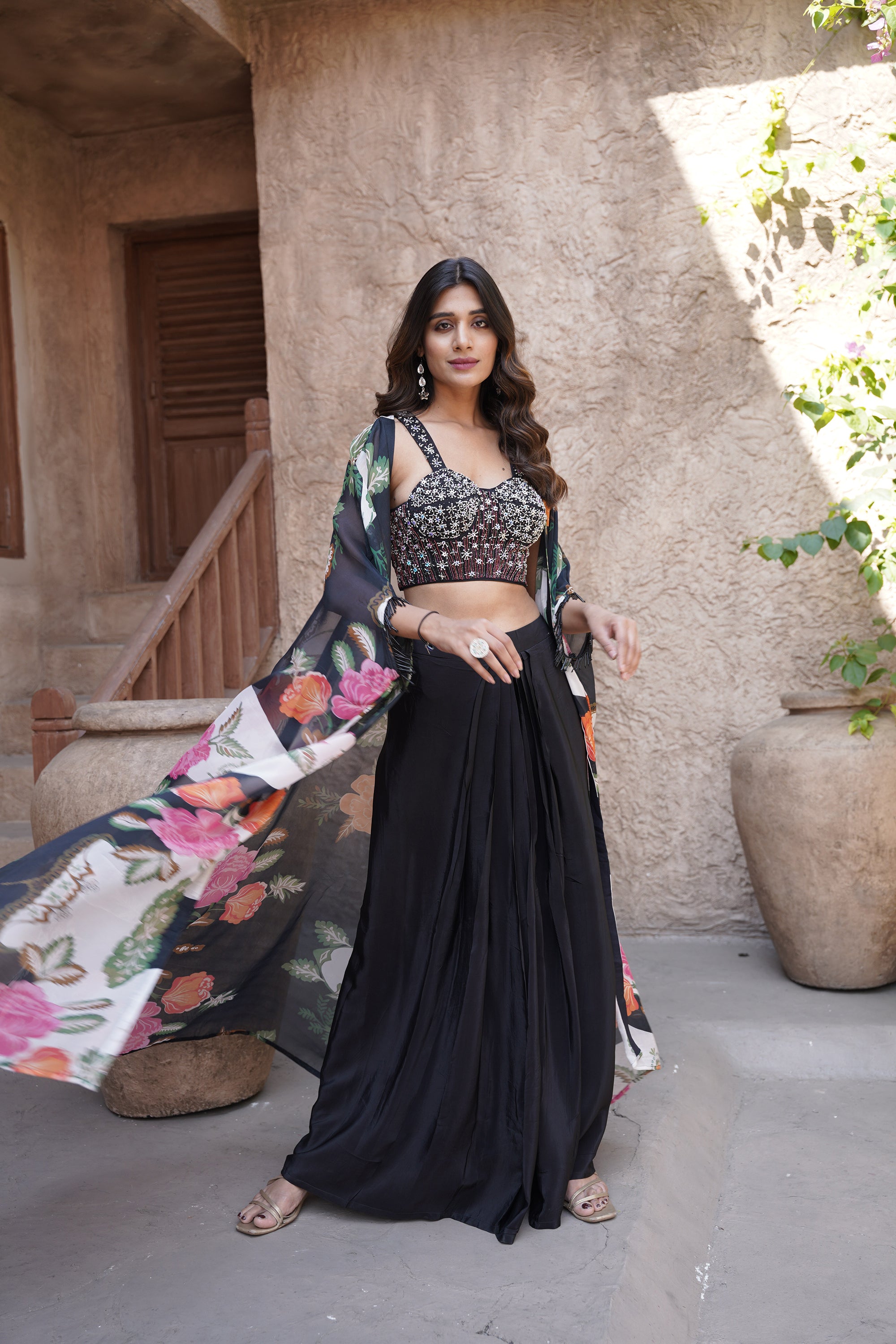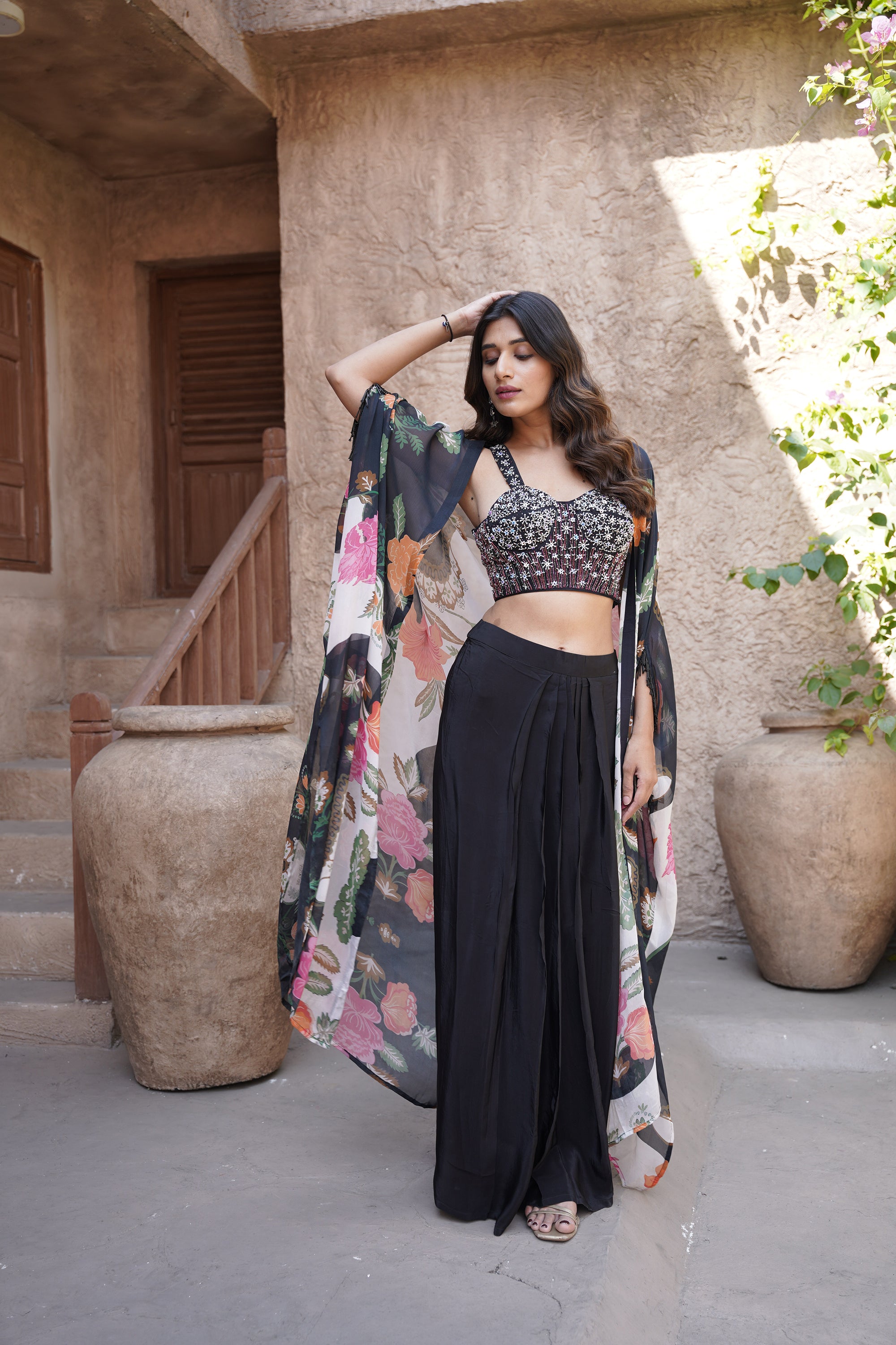 Embroidered Blouse With Cape & Drape Skirt