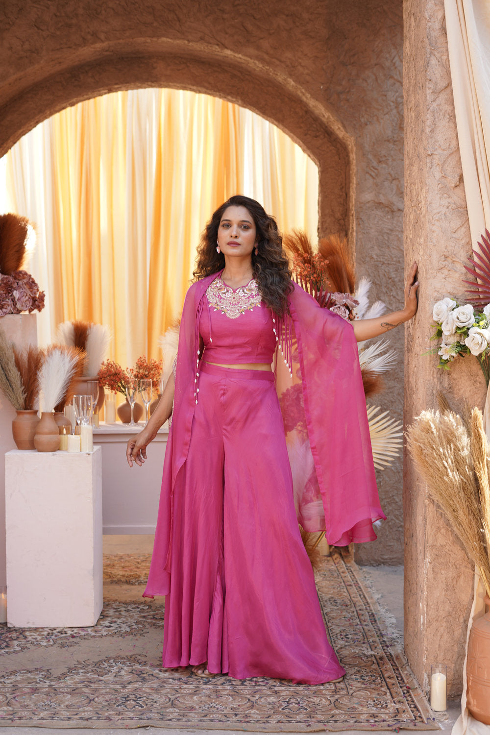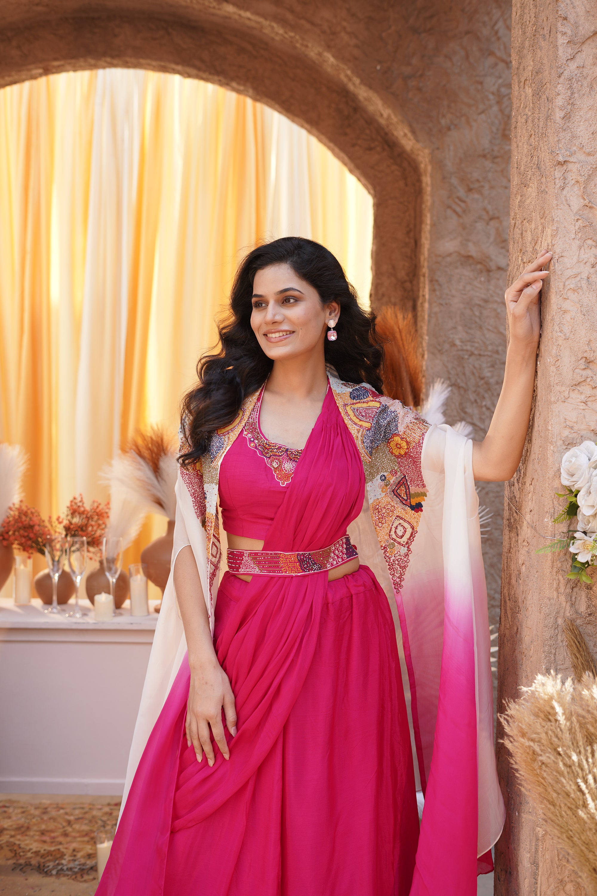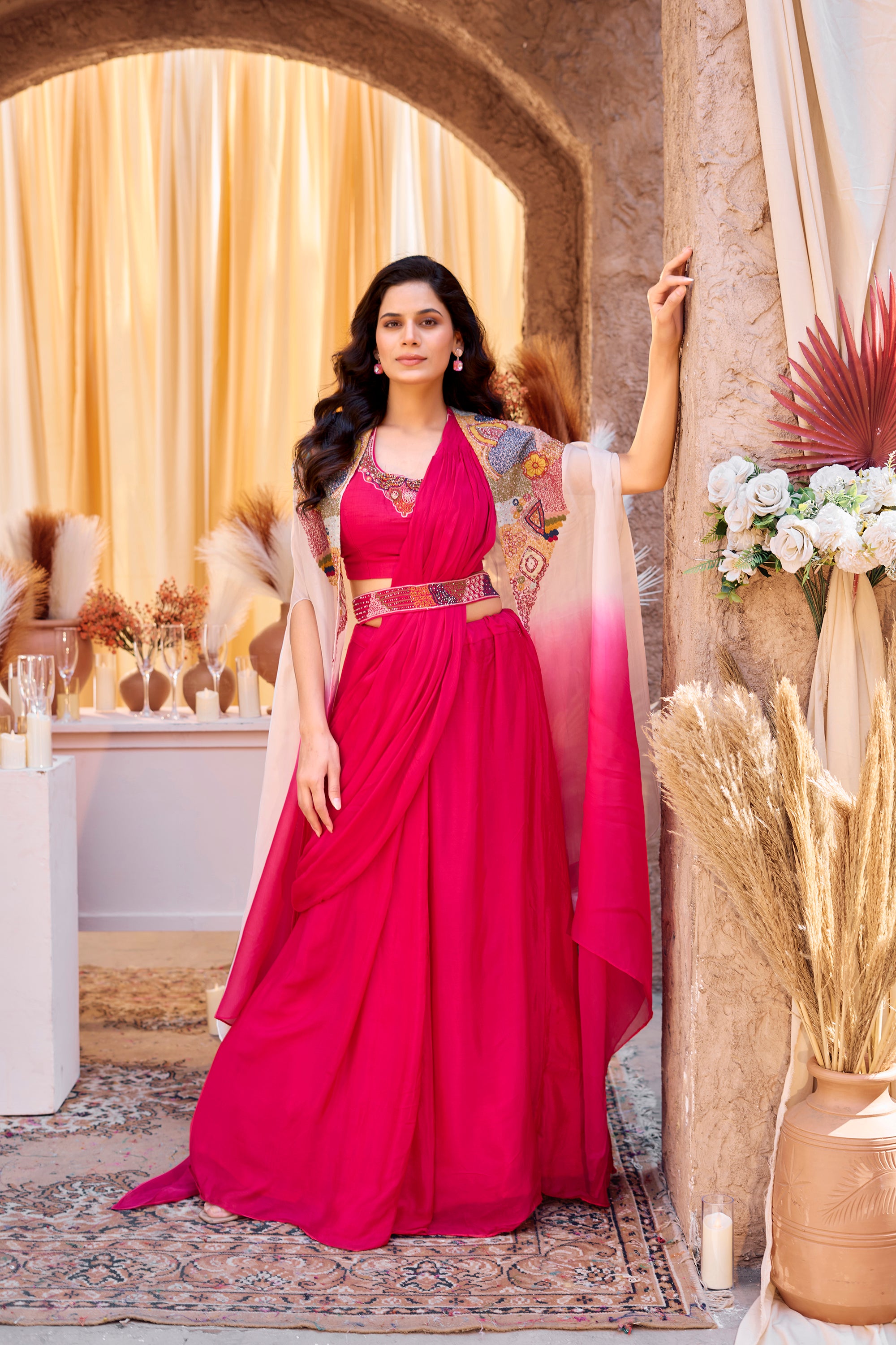 Iconic Fuchsia Draped - Ombre Embroidered Jacket Set