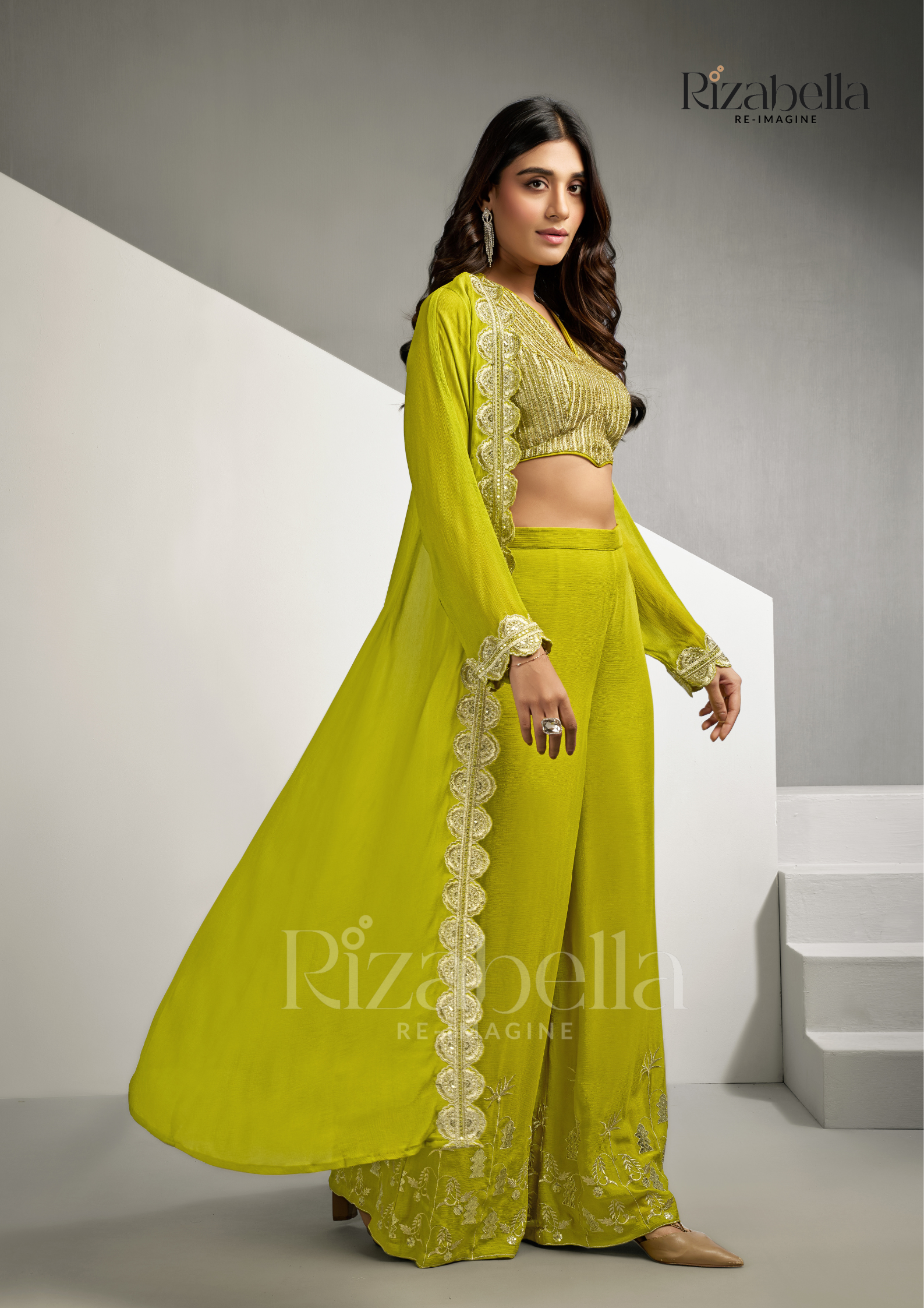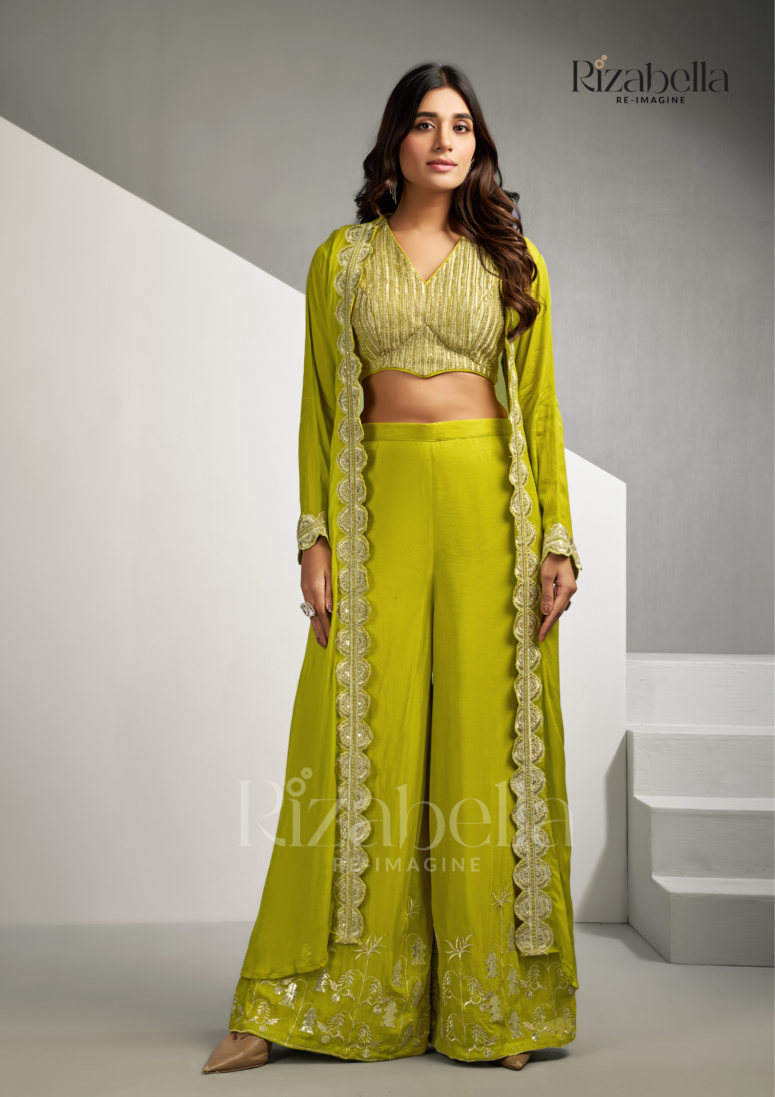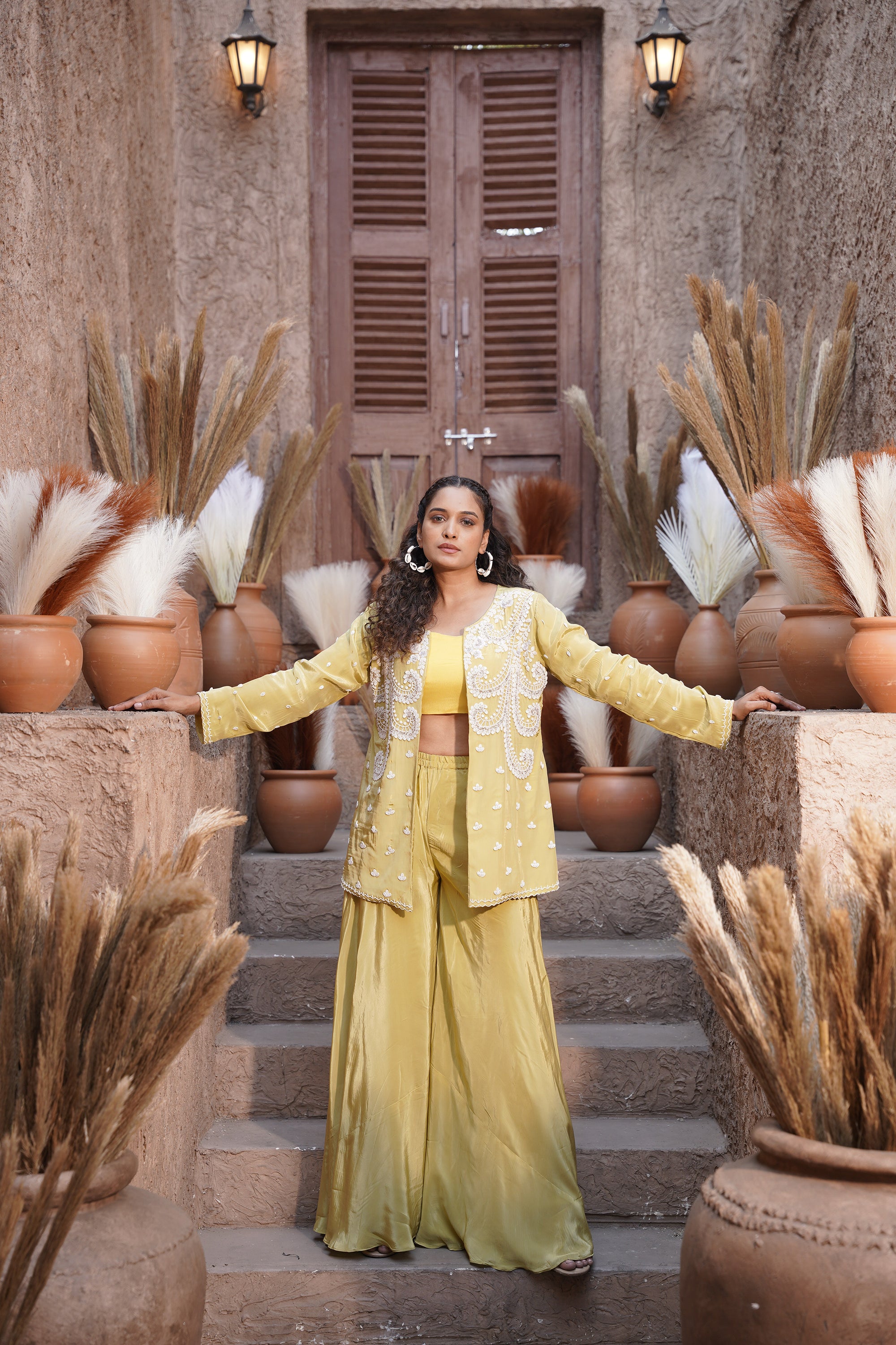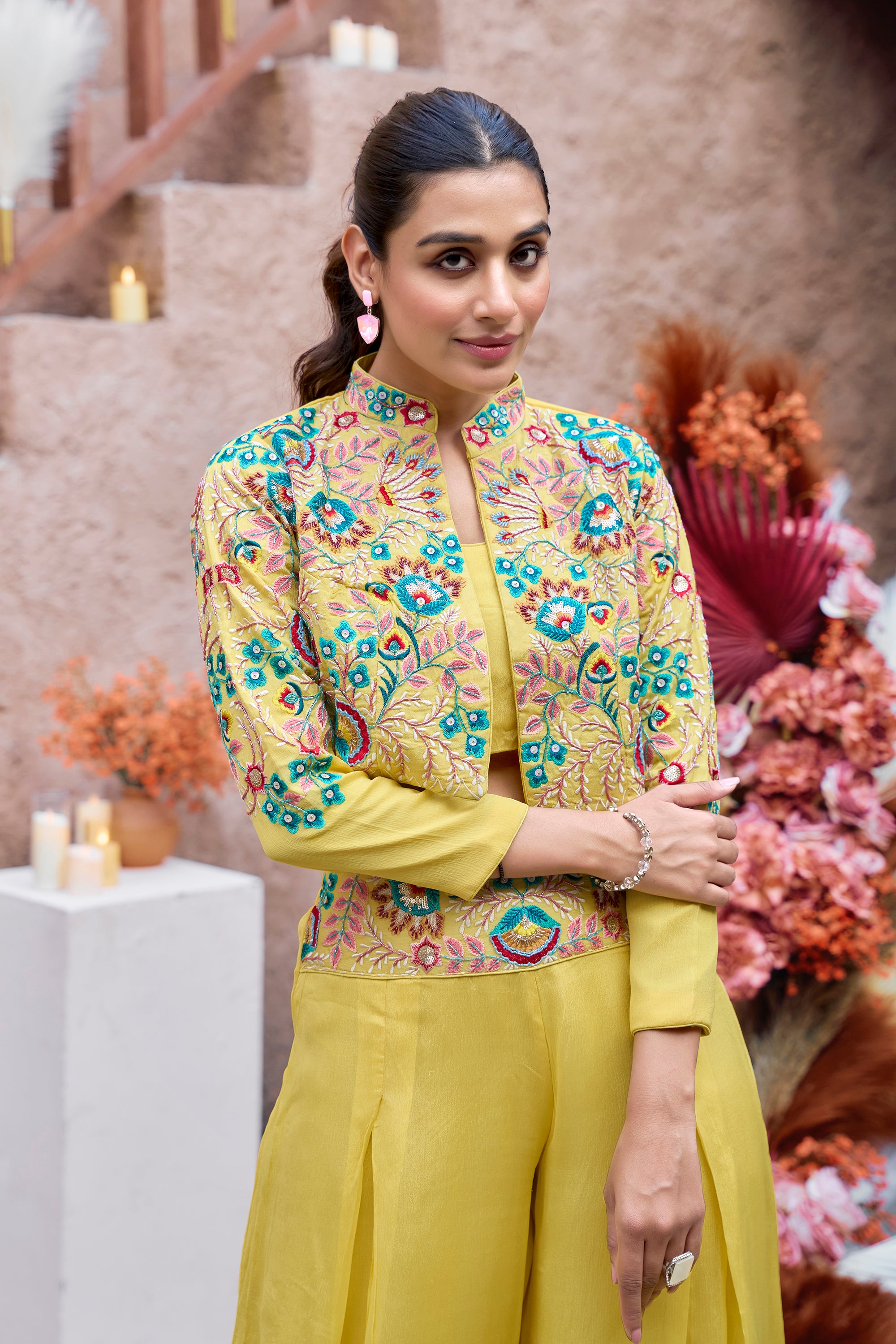 Embroidered jacket, palazzo three-piece set - Yellow Green