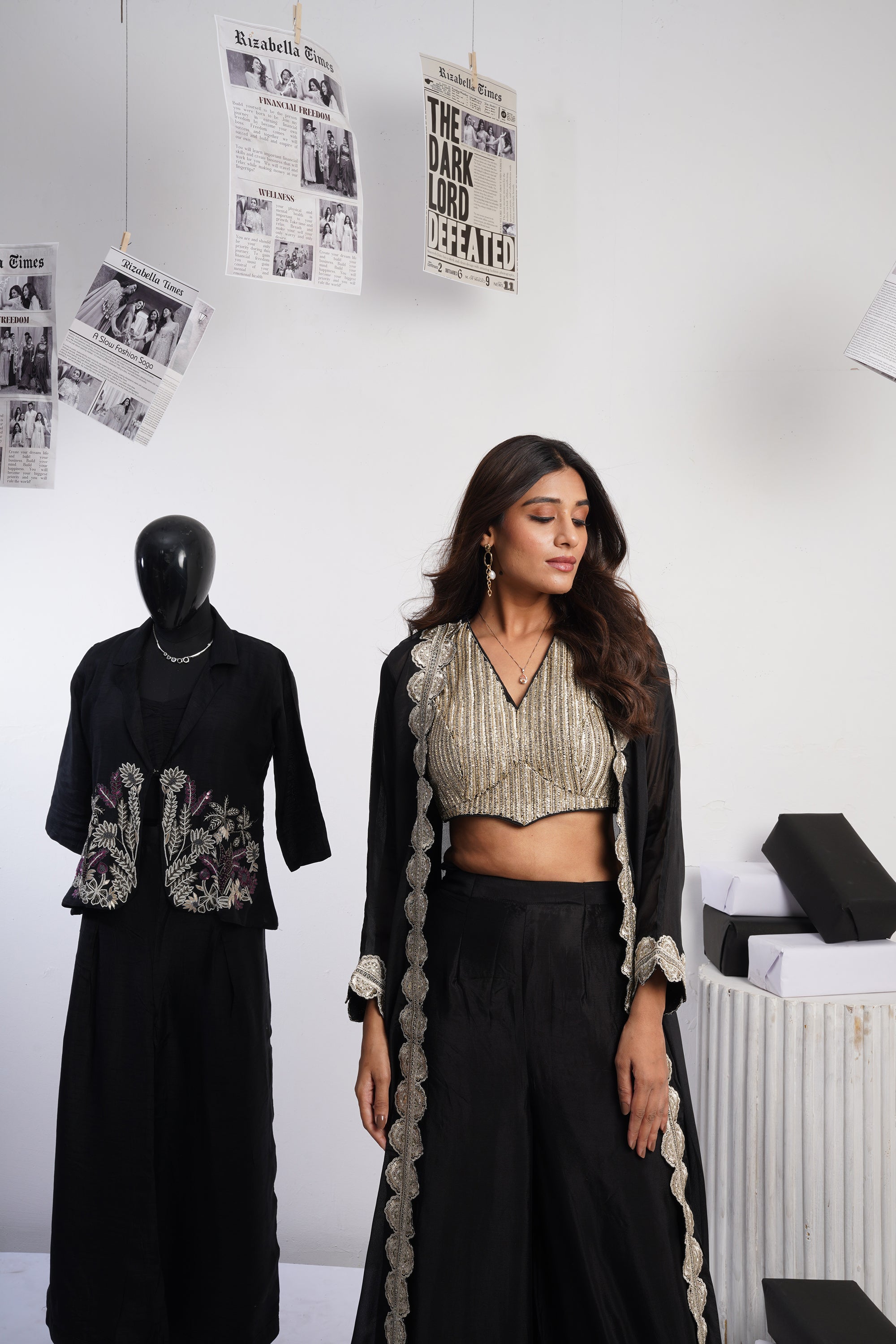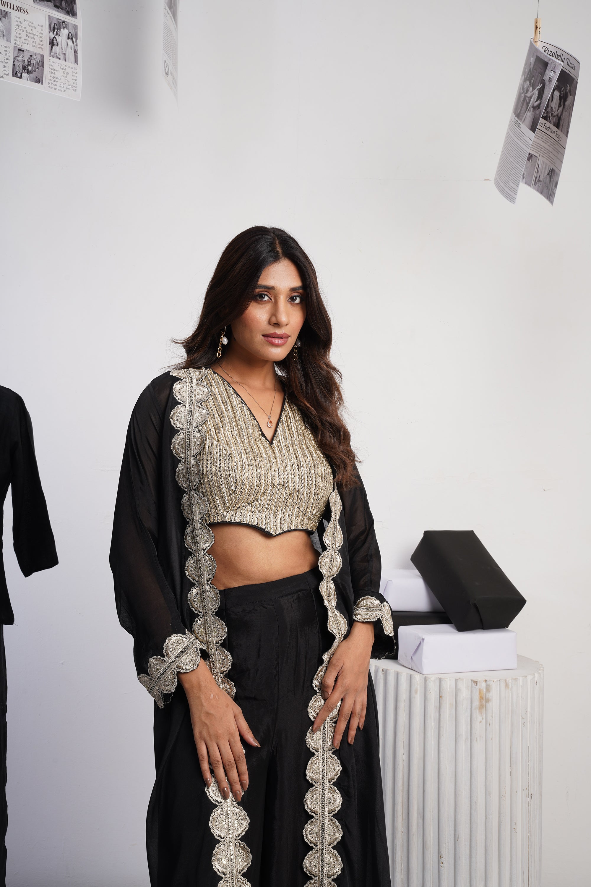 Cut-out Blazer Set with draped skirt - Black