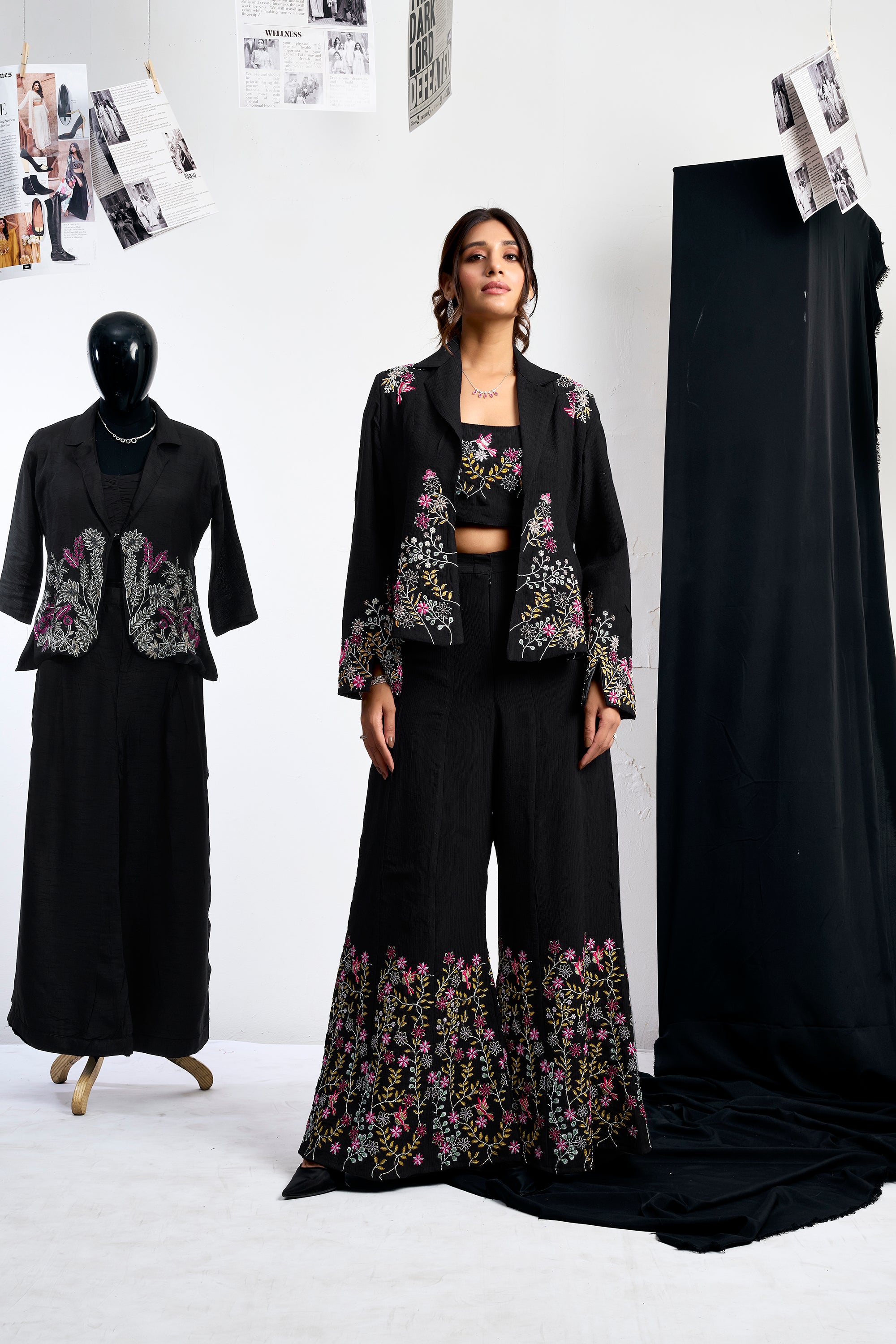 Floral Embroidered Jacket Set - Black