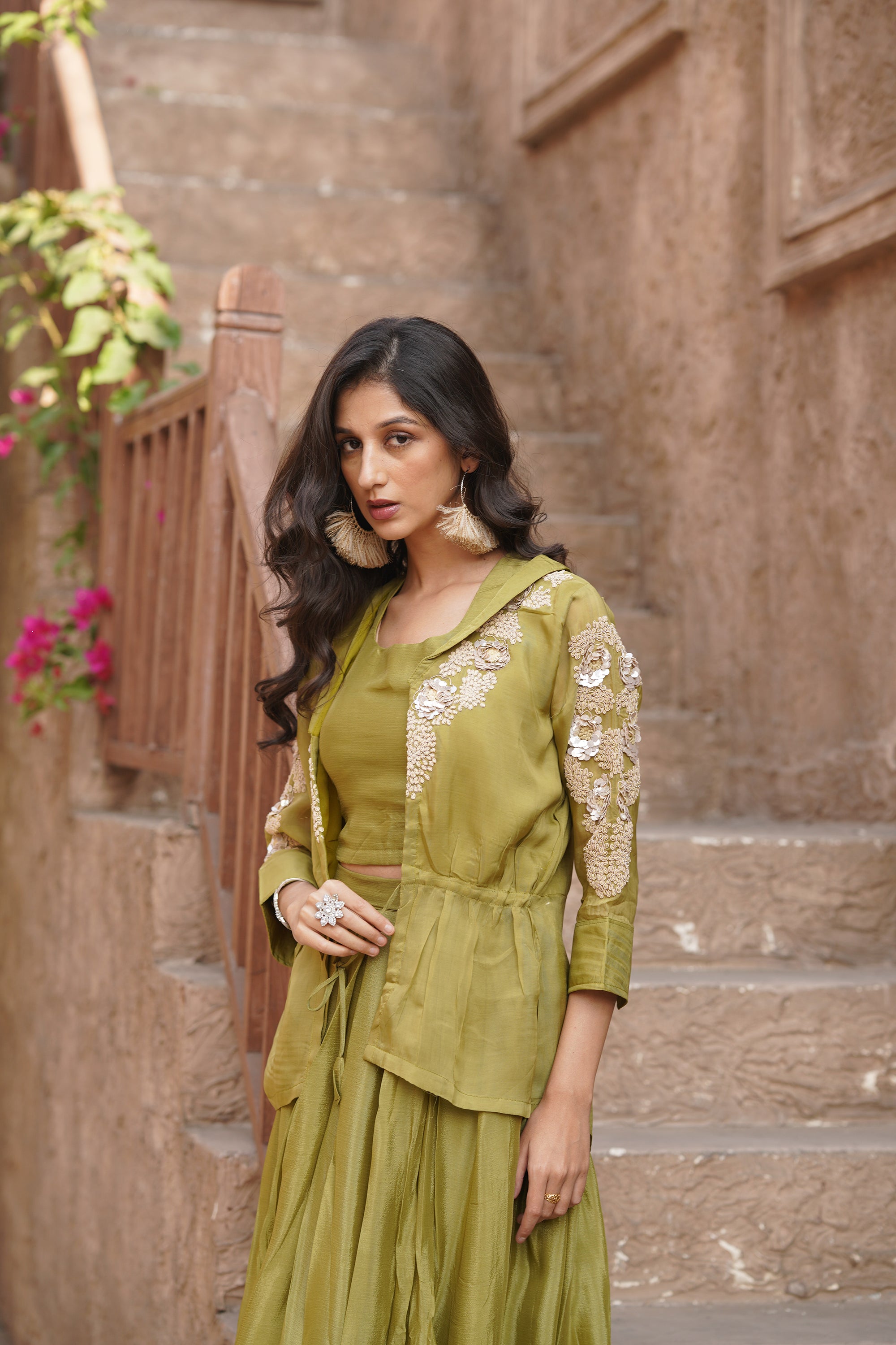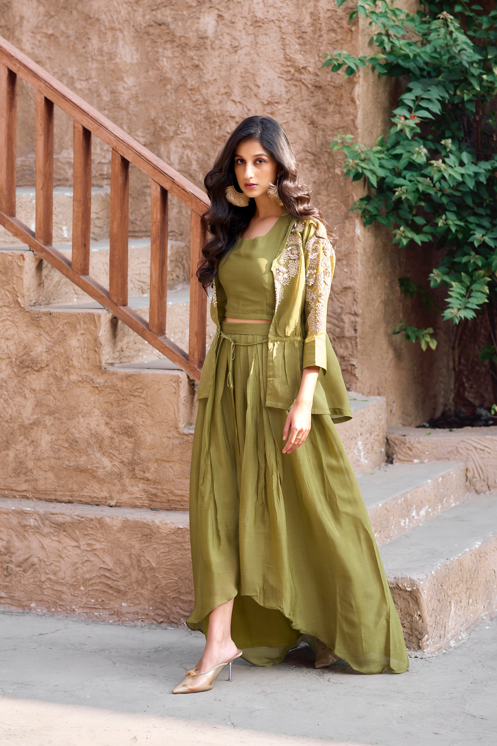 Olive green embellished sleeves shrug set