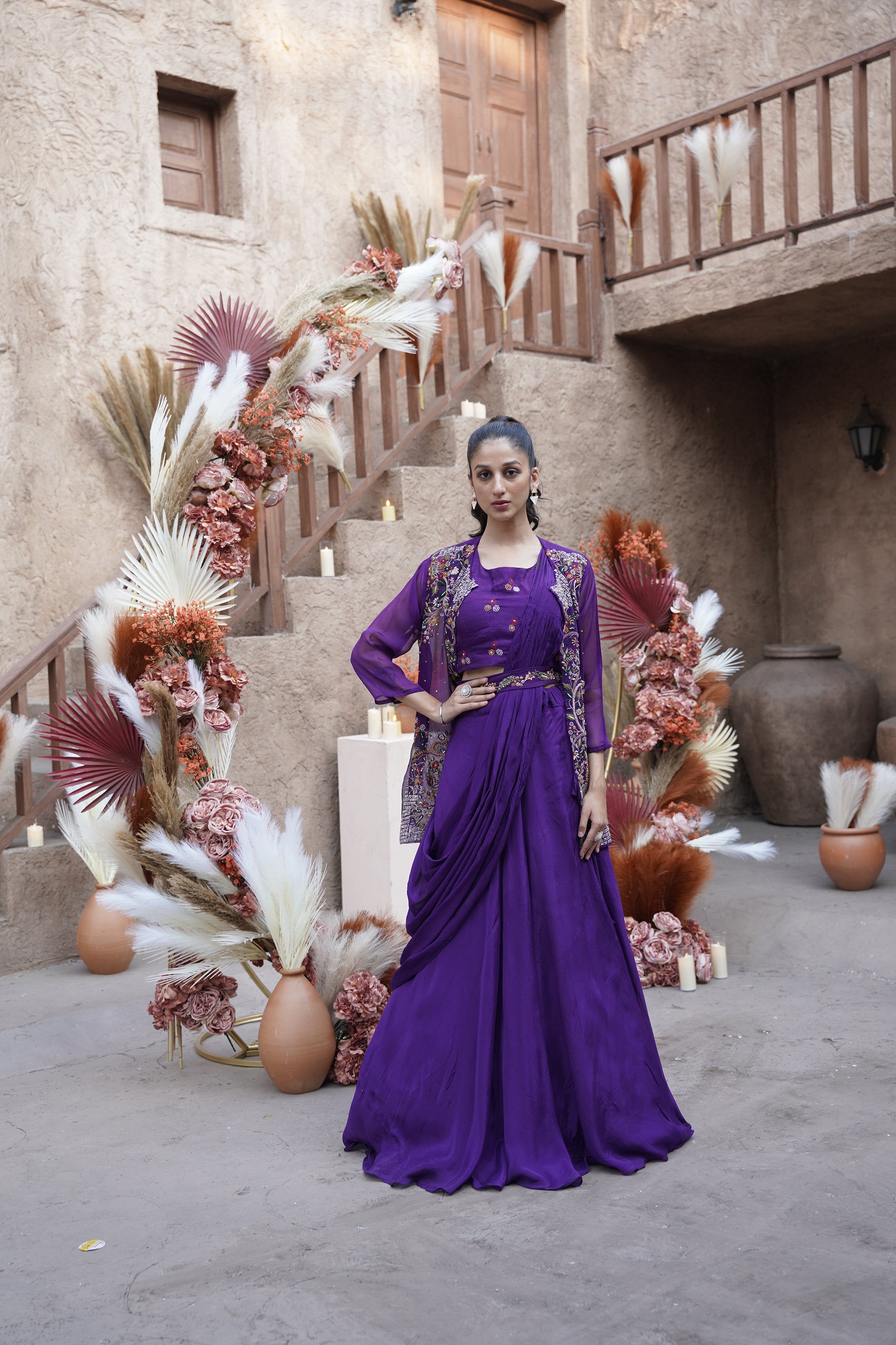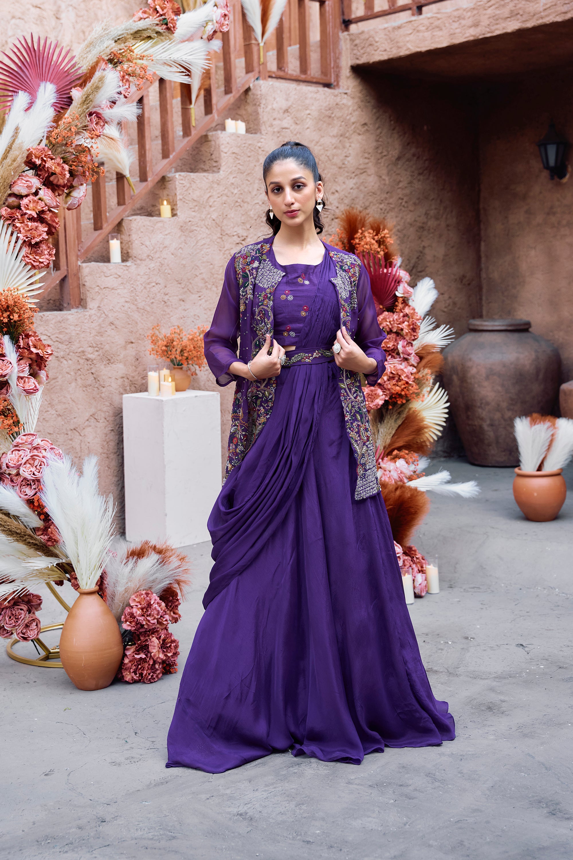 Gold Embroidered Jacket Set - Purple