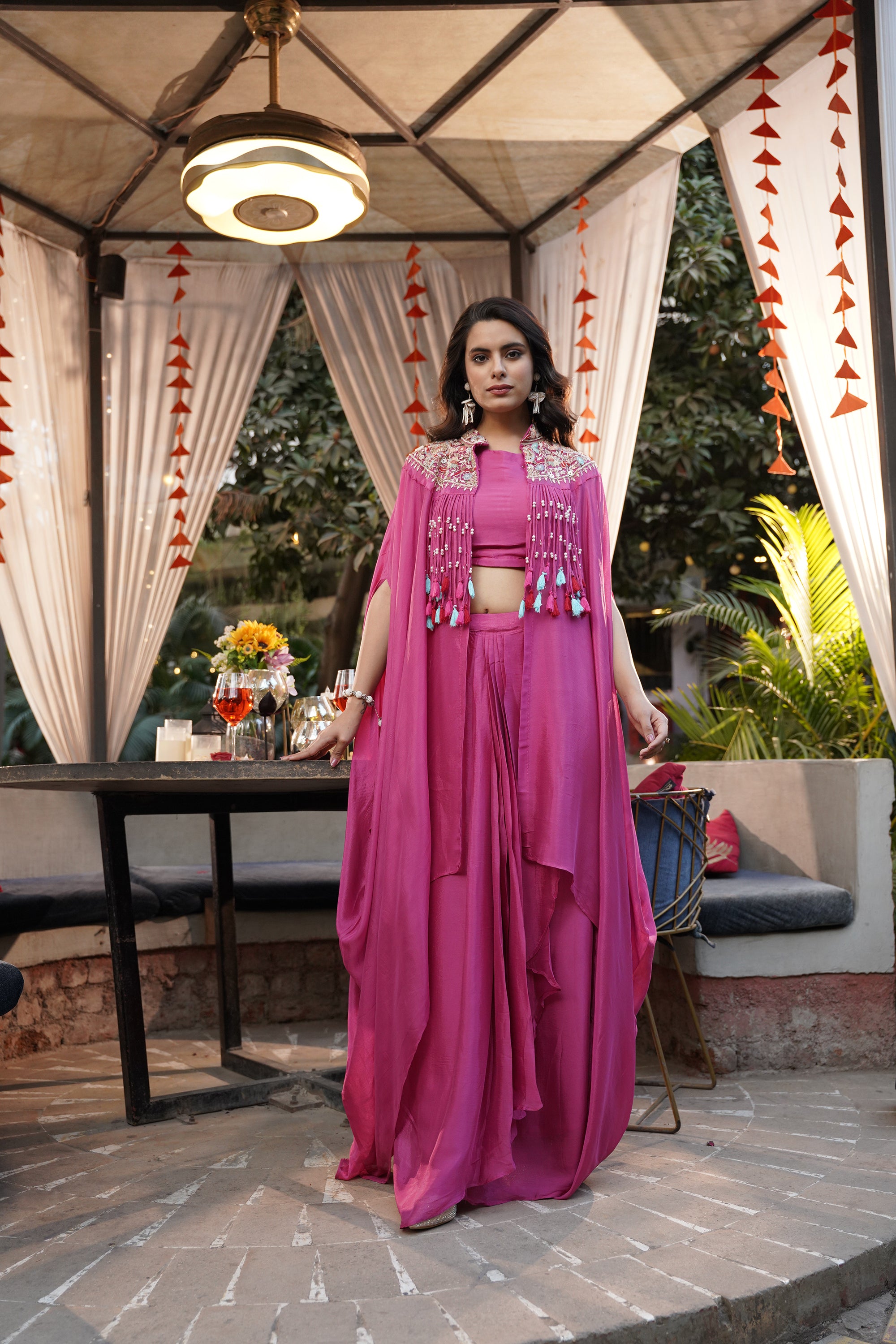 Embroidered Tassel Kaftan Set - Fuchsia Pink