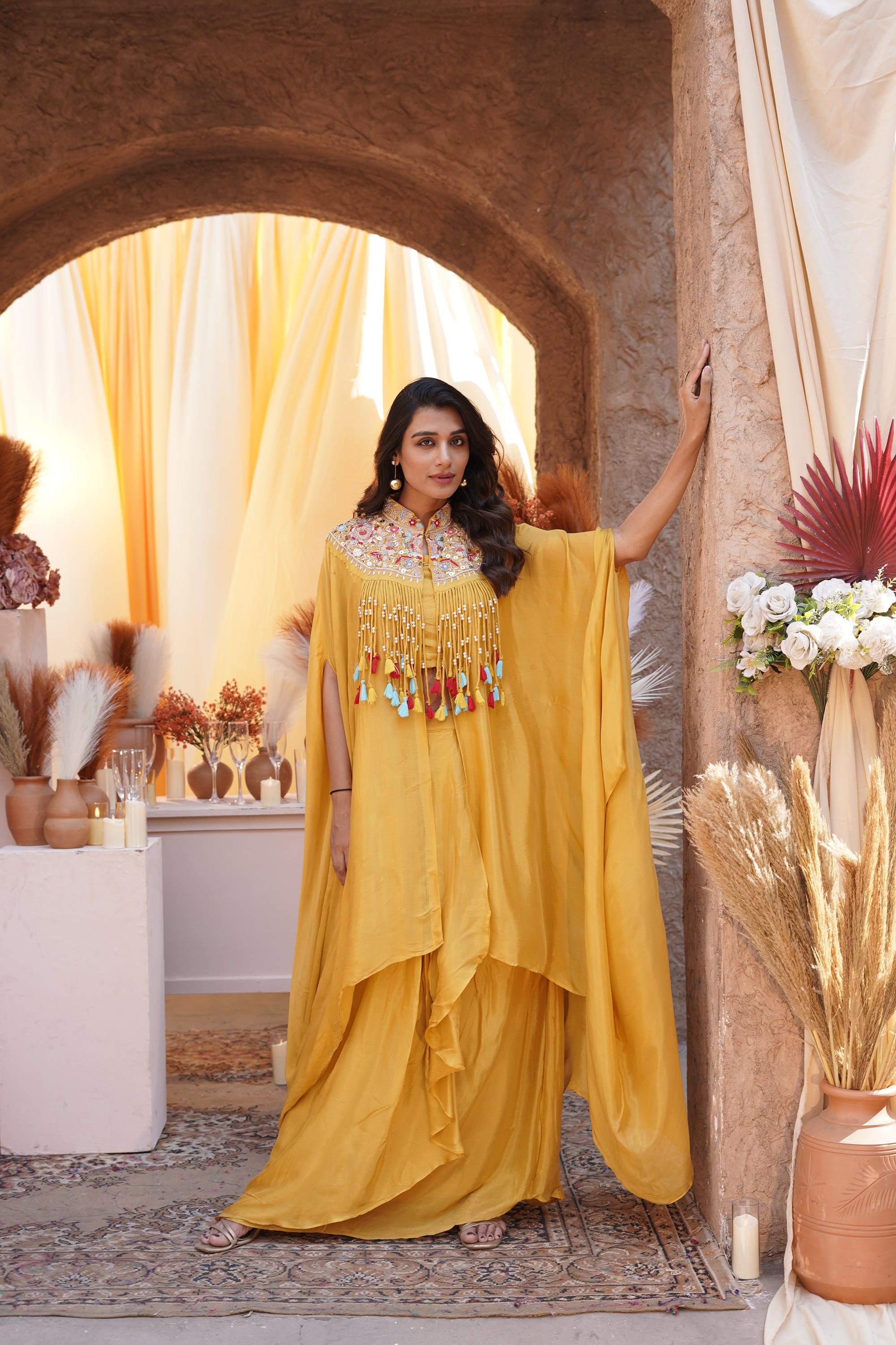 Embroidered Tassel Kaftan Set - Yellow