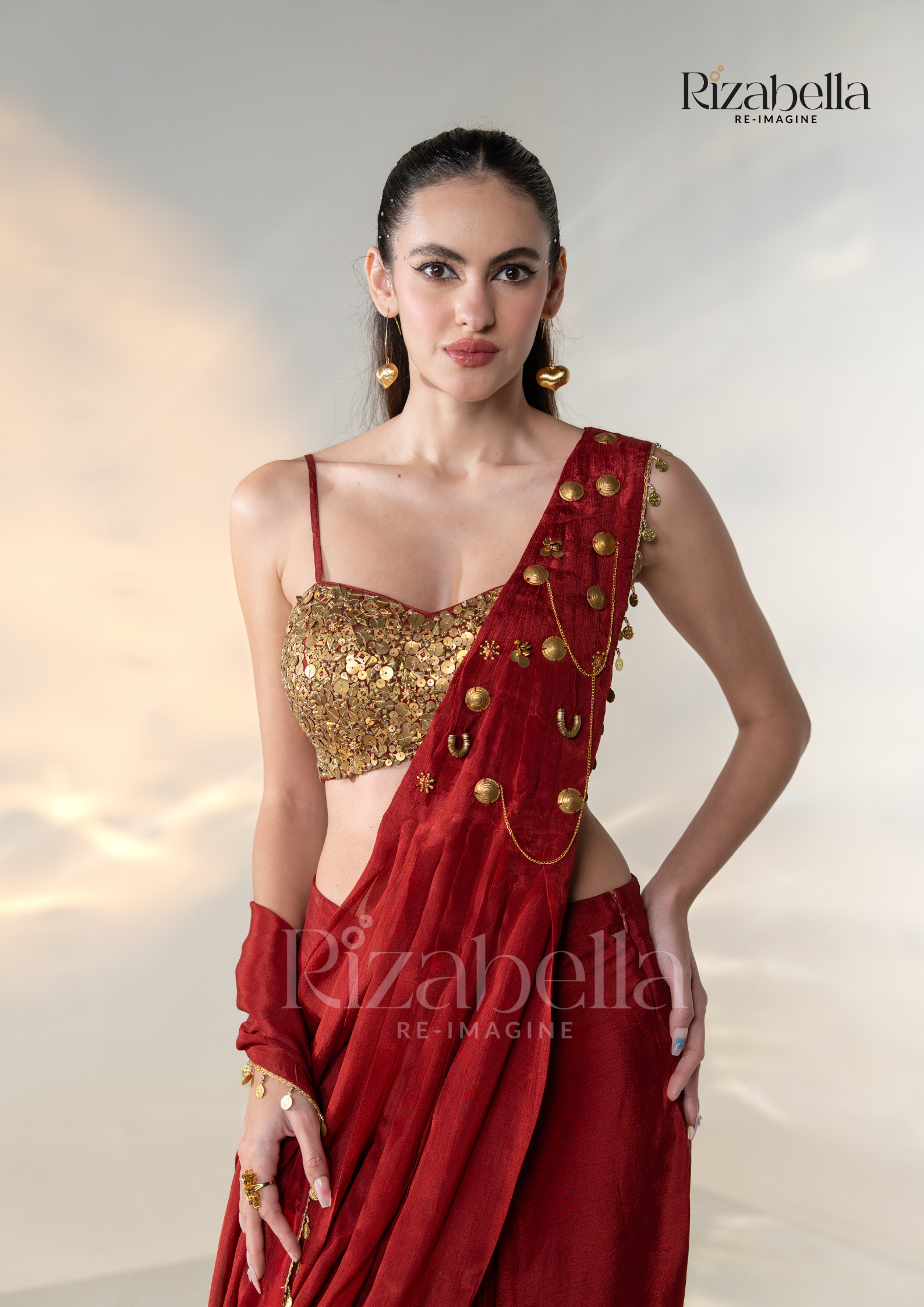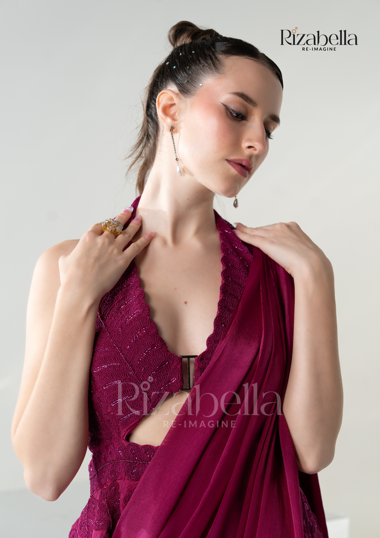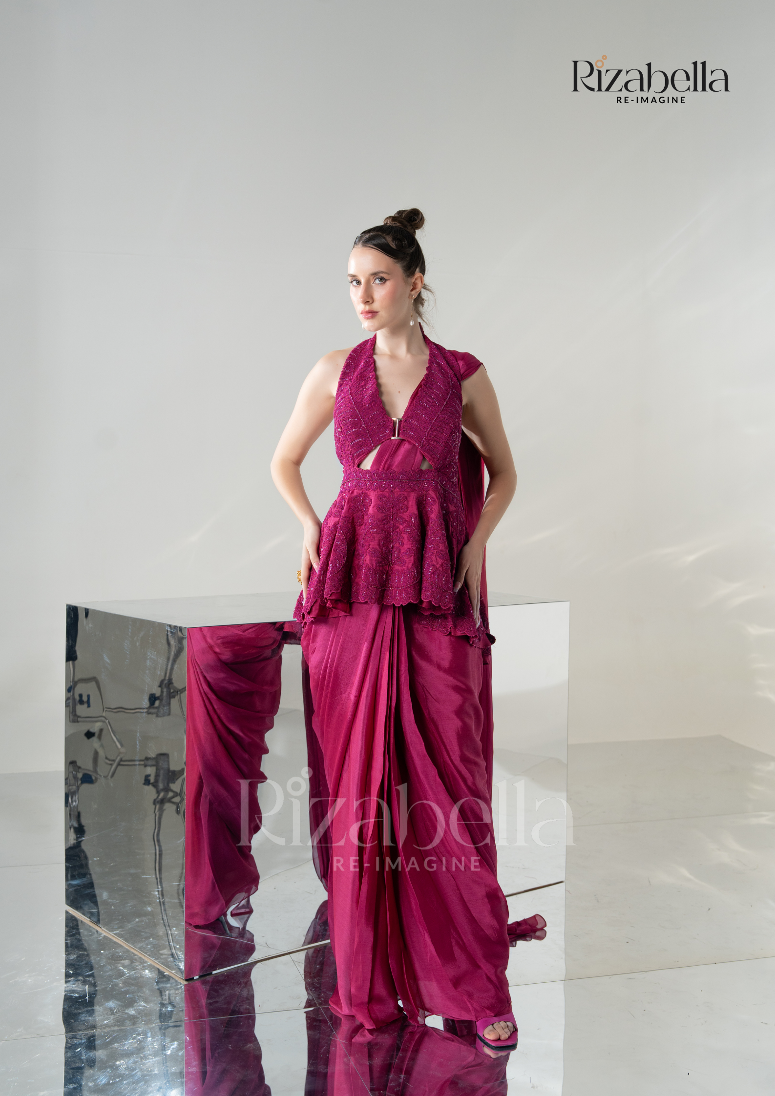 Draped Saree Style Embroidered Vest Set - Fuchsia Pink