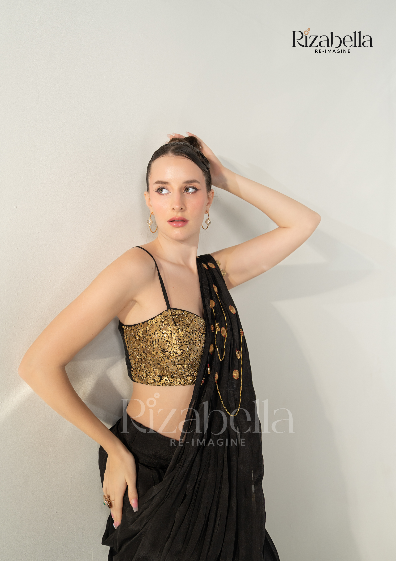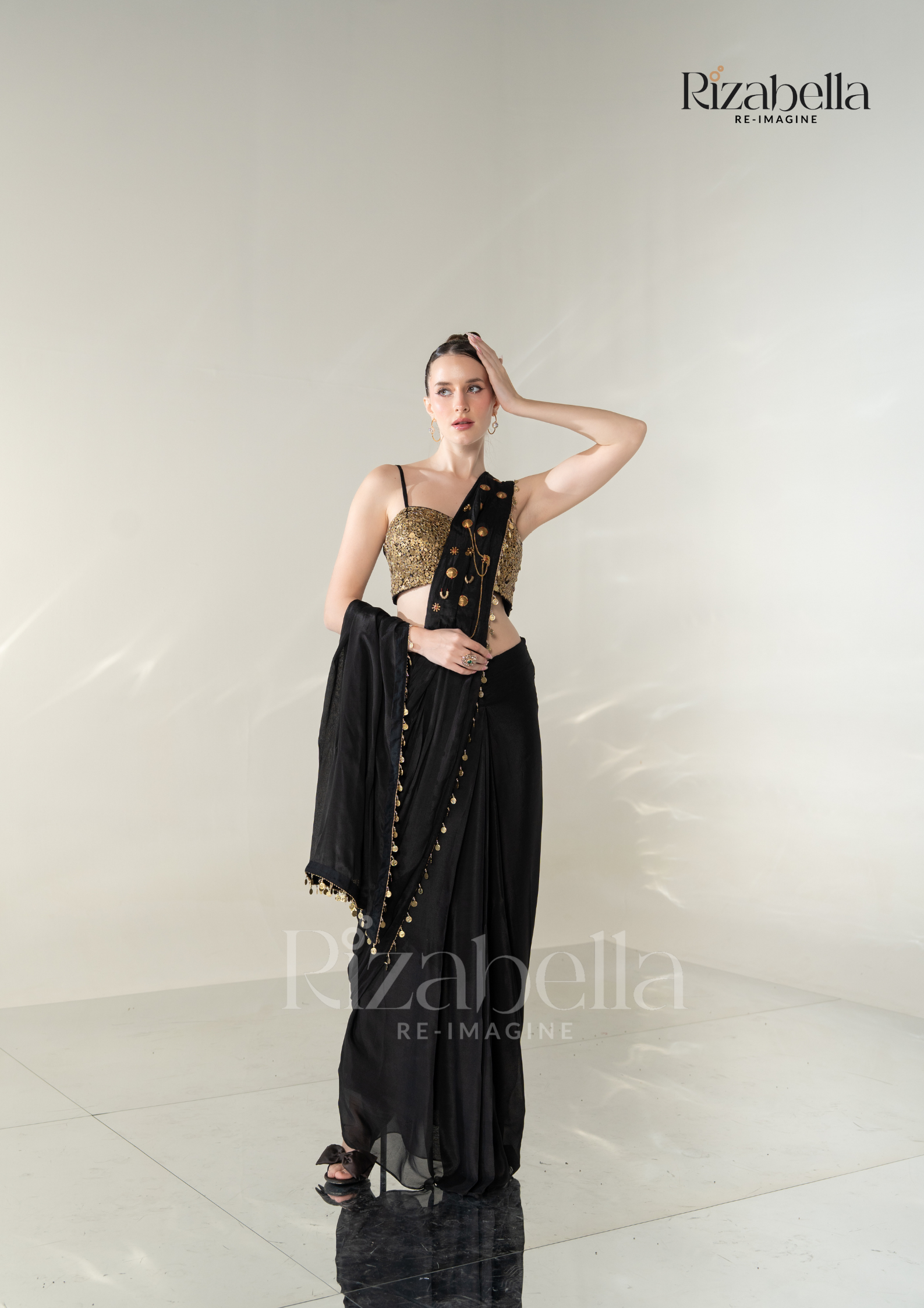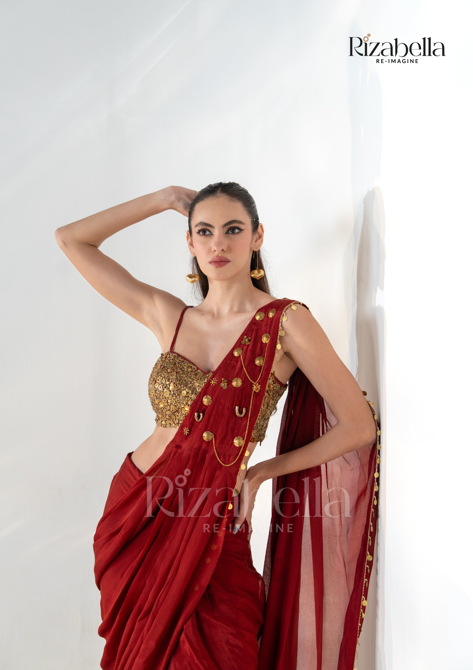 Draped Saree Style Embroidered Vest Set - Fuchsia Pink