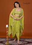 THE GARMENT HAVE A FUSION DESIGN, ELEMENTS LIKE EMBROIDERY WITH METALLIC THREAD, LIKELY GOLD AND OFTEN USED FOR SUCH PARTY WEAR DRESSES.