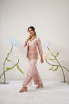 THE ENSEMBLE FEATURE A SHORT STYLE OUTFIT CONSISTING OF A THREE PCS SET WITH INTRICATELY EMBROIDERD JACKET WITH A LAPEL COLLAR.