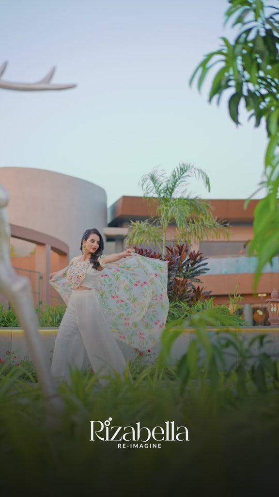 This elegant ensemble features a structured embroidered blouse with intricate mirror and threadwork. A flowy white palazzo in soft fabric ensures grace and comfort. A floral-printed cape cascades from the shoulders, enhancing its ethereal charm.