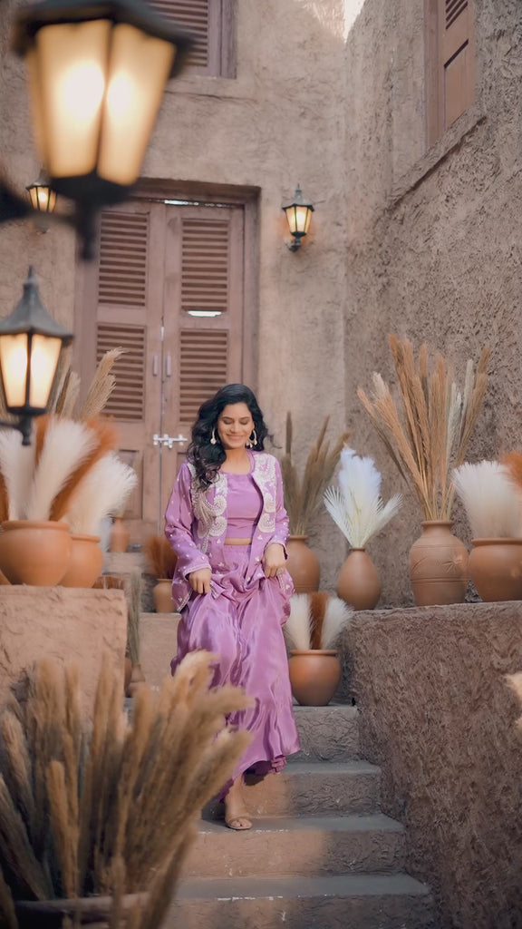 Embroidered Jacket, Palazzo Three-Piece Set - Lilac