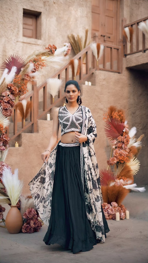 The contrasting yoke, decorated with shell embellishments and stylish lines, stands out against the deep black fabric, creating a bold center of attention. The printed cape, finished with delicate shell and bead work, completes the look by adding rich texture and elegance, making a strong and stylish statement.
