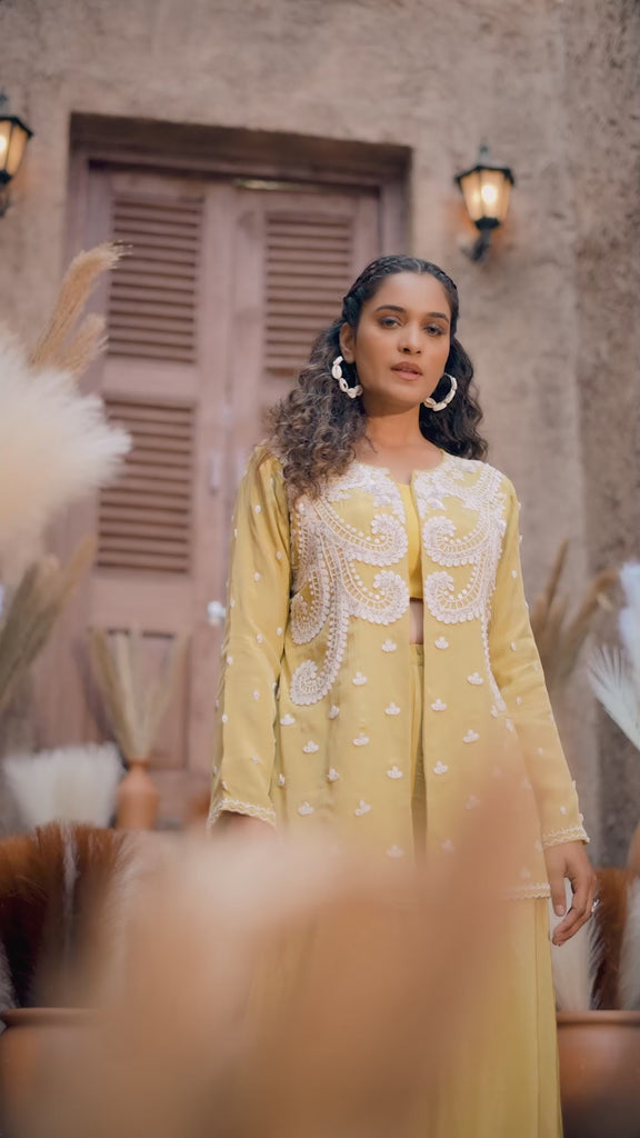 Embroidered jacket, palazzo three-piece set - Yellow Green