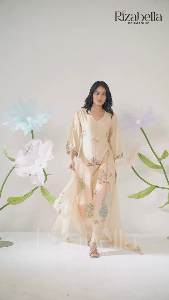 A graceful V-neck straight kurta paired with cigarette pants and a dupatta, adorned with multi-color hand embroidery embroidery inspired by floral and peacock motifs. This pastel ensemble blends tradition with modern minimalism, perfect for day festivities.