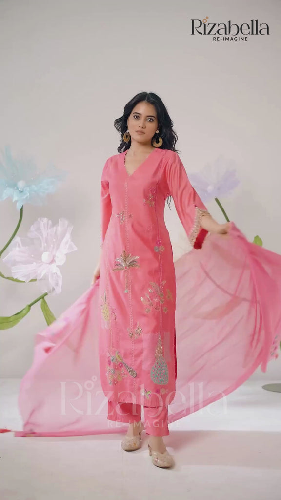 A graceful V-neck straight kurta paired with cigarette pants and a dupatta, adorned with multi-color hand embroidery embroidery inspired by floral and peacock motifs. This pastel ensemble blends tradition with modern minimalism, perfect for day festivities.