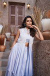 This stylish outfit features a cropped inner top paired with high-waisted palazzo pants, giving it a modern yet graceful look. A sleeveless, long tiered jacket finishes the ensemble, decorated with intricate white bead and thread embroidery along the edges and yoke, adding a refined and artistic touch.