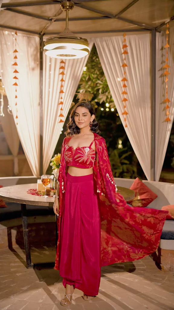 Make a statement with this elegant three-piece set, featuring a cropped blouse and a draped skirt. An attached cape flows beautifully, adding a soft, dramatic touch. Intricate embroidery and delicate beadwork on the blouse and along the cape's edges add a gentle sparkle, making every movement look graceful and refined.