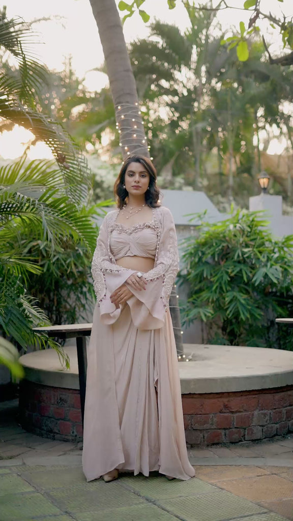 This sophisticated three-piece set features a cropped blouse, a draped long skirt, and a flowing jacket that adds effortless movement. The blouse bodice and jacket are delicately decorated with light-toned embroidery for a subtle, artistic touch. Floral appliqué patches and intricate beadwork on the bodice create a soft yet striking focal point, perfectly complementing the ensemble’s graceful silhouette.