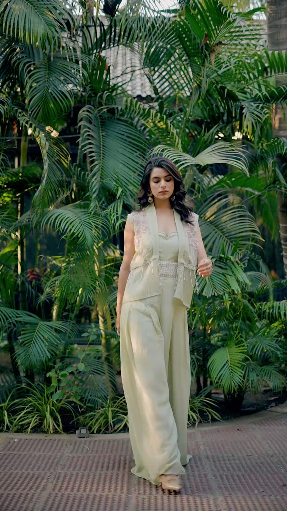 Soft ivory features a fitted jumpsuit with wide-leg bottoms, paired with a short, sleeveless jacket. The jacket is decorated with delicate, light-toned floral threadwork, mainly highlighting the edges and yoke for a subtle, refined look.