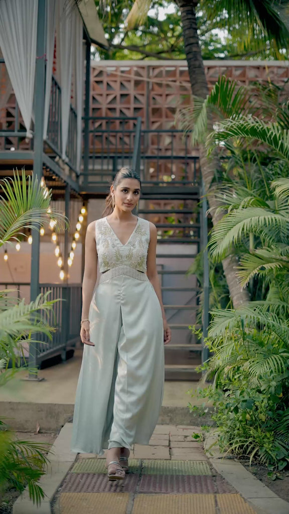This stylish jumpsuit features a sleeveless cropped bodice paired with flowing, floor-length wide-leg trousers, creating a sleek and graceful silhouette. The V-neckline is beautifully decorated with gold-toned threadwork and delicate bead detailing, adding a hint of luxury to the clean, minimalist design.